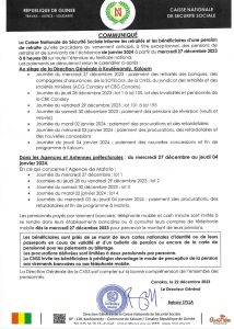 La Caisse Nationale de Sécurité Sociale informe les retraités et les bénéficiaires d’une pension de retraite qu’elle procédera au versement anticipé, à titre exceptionnel, des pensions de retraite et de survivants de l’échéance de janvier 2024 à partir du mercredi 27 décembre 2023 à 8 heures 00 sur toute l’étendue du territoire national. Les paiements se dérouleront selon le calendrier ci-après: