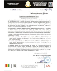 Les fidèles musulmans et chrétiens sont appelés à se rassembler dans les mosquées, églises, chapelles et temples ce vendredi, 17 mai 2024 et le dimanche, 19 mai 2024 pour implorer la protection de la Guinée.