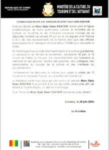« En hommage à sa contribution inestimable à la culture guinéenne, un symposium se tiendra le lendemain, dimanche 30 juin, à 10 heures au Palais du Peuple. Ce rassemblement, qui honorera sa mémoire et ses œuvres, réunira des proches, des collègues, des personnalités du monde de la culture et des membres du gouvernement », indique le Ministère qui renseigne que « l’enterrement se déroulera le même jour, après la prière de 13 heures à la mosquée Fayçal, au cimetière de Cameroun ».