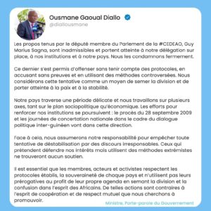 « Les propos tenus par le député membre du Parlement de la CEDEAO, Guy Marius Sagna, sont inadmissibles et portent atteinte à notre délégation sur place, à nos institutions et à notre pays. Nous les condamnons fermement.