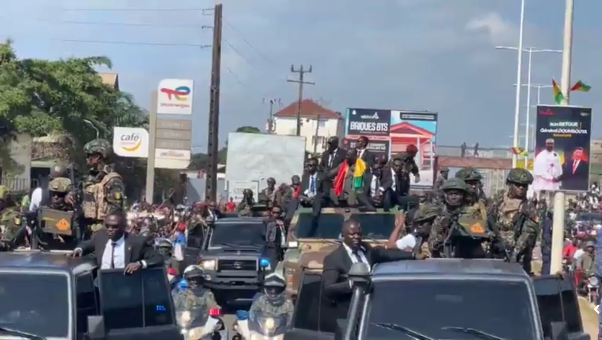 Le général, crâne rasé, dans un costume Mao, sans lunettes a salué ses compatriotes qui scandaient des slogans en sa faveur et pour son maintien au pouvoir. De l’aéroport AST au palais Mohammed V à Kaloum, la foule fortement mobilisée en t-shirts sur lesquels on peut lire : “Simandou 2040, « mouvement fénènè », « les jeunes soutiennent le CNRD », « athéwala [qui signifie en Maninka il ne part pas] « , « esprit CNRD », « 3 ans de bonheur », « Doumbouya, il n’ya pas photo ».