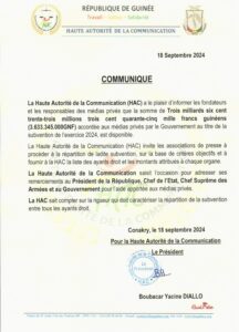 La Haute Autorité de la Communication (HAC) a le plaisir d’informer les fondateurs et les responsables des médias privés que la somme de Trois milliards six cent trente-trois millions trois cent quarante-cinq mille francs guinéens (3.633.345.000GNF) accordée aux médias privés par le Gouvernement au titre de la subvention de l’exercice 2024, est disponible.