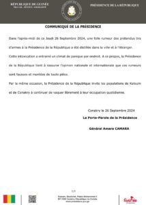 Dans l’après-midi de ce Jeudi 26 Septembre 2024, une folle rumeur des prétendus tirs d’armes à la Présidence de la République a été distillée dans la ville et à l’étranger.