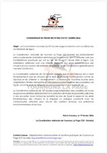 Après l’arrestation de 24 manifestants, dont 9 mineurs, à Siguiri lors de mobilisations contre l’exploitation minière, la Coordination nationale de TLP-Guinée dénonce des détentions arbitraires et exige leur libération immédiate et sans condition, au nom du respect des libertés fondamentales garanties par la Constitution.